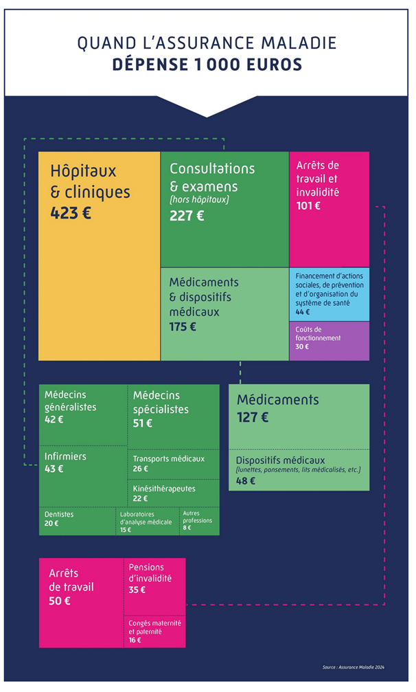 L’infographie jointe représente la répartition de 1 000 euros de dépenses de l’Assurance Maladie sous forme de rectangles imbriqués :